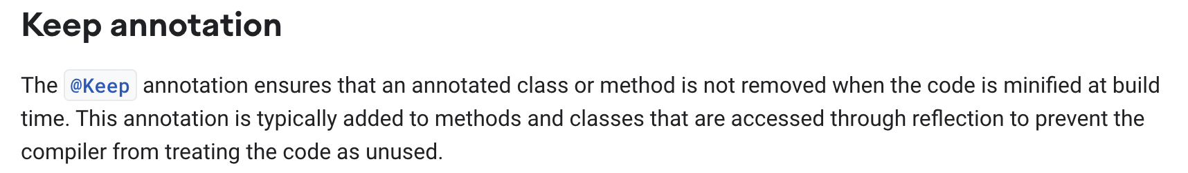 ProGuard๋ฑ ์์ค์ฝ๋ ์ต์ ํ ์งํ์์ Reflection์ผ๋ก ์ ๊ทผํด์ผ ํ๋ ์์ ํน์ ์ต์ ํ๊ฐ ์งํ๋์ด๋ ์ ์ง๋์ด์ผํ๋ ๊ฐ์ ๊ฒฝ์ฐ ์ถ๊ฐํ์ฌ ์ฌ์ฉํฉ๋๋ค.