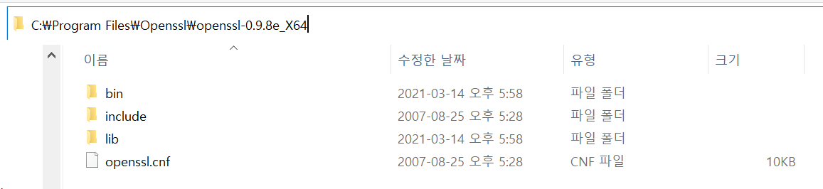 (์ ๋ C:\Program Files์์น์ Openssl์ด๋ผ๋ ํด๋๋ฅผ ์์ฑํด ๊ทธ ์์ ์์ถํ์ผ์ ์์น ์์ผฐ์ต๋๋ค.)