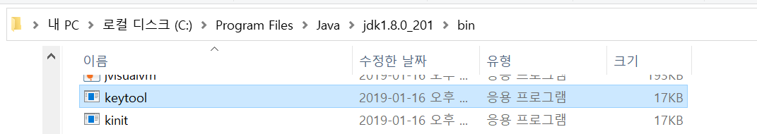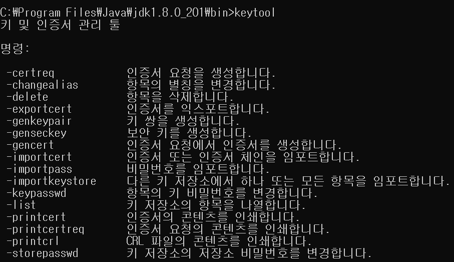 jdk/bin ํด๋์๋ keytool.exe ์คํํ์ผ์ด ์์นํด ์๋ค.