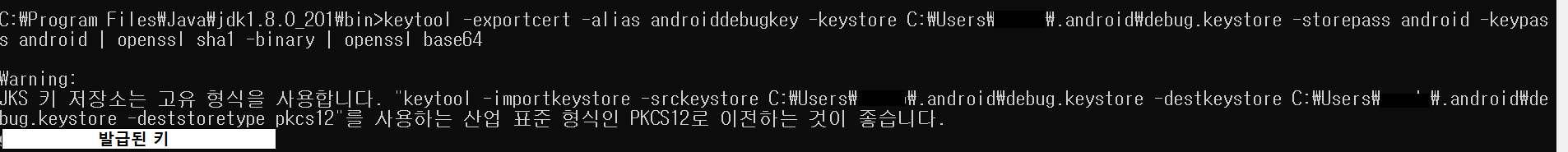 keytool -exportcert -alias androiddebugkey -keystore C:\Users\{์ ์ ์ด๋ฆ}\.android\debug.keystore -storepass android -keypass android | openssl sha1 -binary | openssl base64